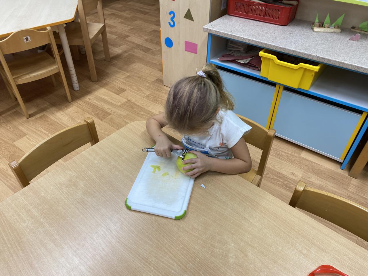 Velkým zážitkem bylo, že jsme si upekli svůj koláč s jablíčky. Hned ráno, jak nás bylo více, si děti oblékly přinesené zástěrky z domu, vytáhly si prkénka a struhadla a začaly strouhat nakrájené a očistěné jablka. Mladší děti hlavně ochutnávaly, ale ty starší poctivě strouhaly. Mezitím jsme si společně řekli, co je potřeba dát do těsta, aby bylo dobré. Všechny suroviny jsme vysypali do mísy, uhnětli těsto, které děvčata vyválela na plech. Na těsto jsme společně dali nastrouhané jablka, opět těsto a na závěr ještě ušlehaný sníh. Paní kuchařka nám koláč upekla, byl moc dobrý. Po obědě jsme si všichni pochutnali.