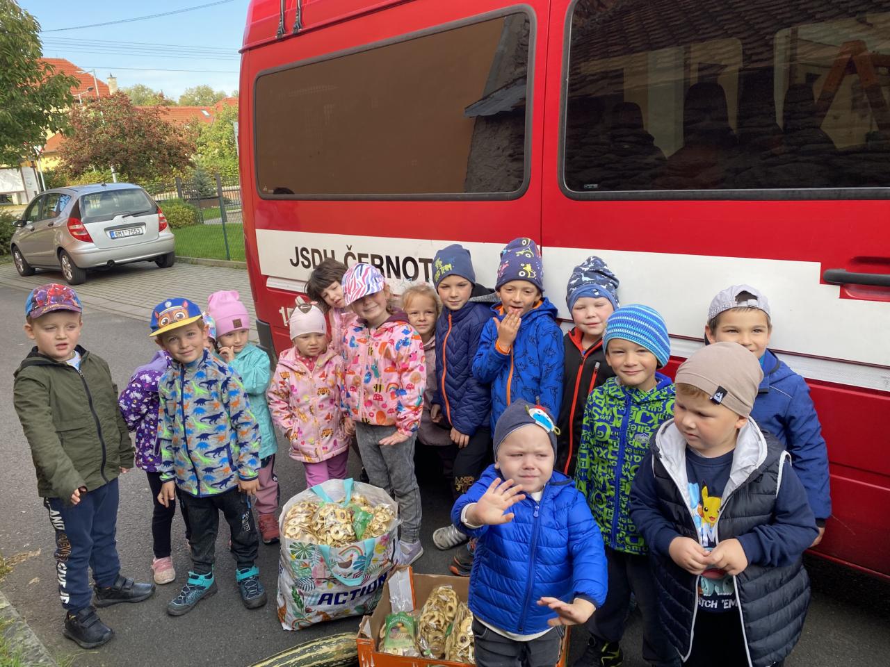 Čtvrteční krásný podzimní den, jsme jeli hasičským autem do Lučic, podívat se, co jde vše vyrobit z jablíček. Děti měly možnost podívat se, jak se lisují jablka na výrobu moštu. V dalších prostorách jsme sledovali krájení jablek na plátky a odměnou byla velká ochutnávka sladkých jablíček. Poslední prostory kam jsme vyšli po schodech, byla místnost s velkou sušičkou na ovoce. Na závěr naší návštěvy si děti nakoupily ve firemní prodejně v Lučicích sušené ovoce pro maminky a tatínky.