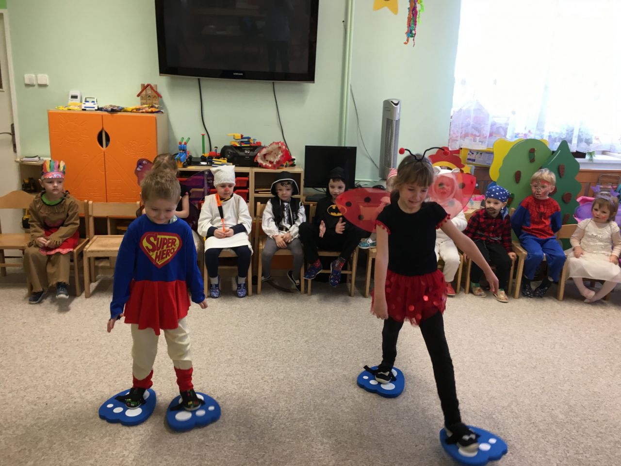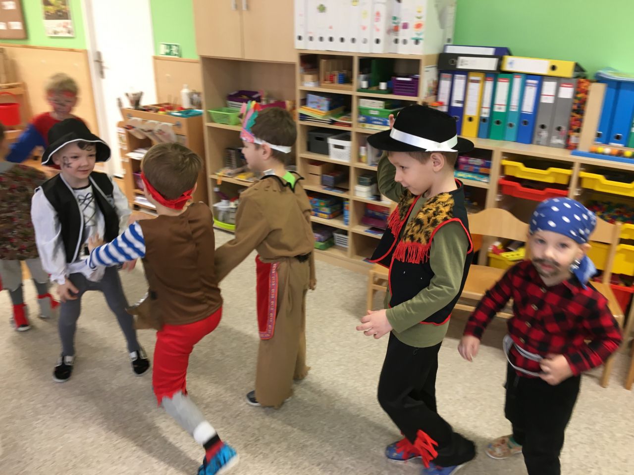 Po vzájemném představení jsme pokračovali pohádkou „Mášenka a medvěd,“ po ní byla svačinka, a to ne obyčejná, ale byly totiž koblížky, které nám usmažily naše paní kuchařky. S plnými bříšky jsme začali s chutí plnit pohádkové úkoly. Nejdříve to byla pohádka Dlouhý, Široký, Bystrozraký, kdy děti soutěžily v sedmimílových botech a orientovaly se dle sluchu, dále pokračovaly v třídění čočky a hrachu jako Popelky a první část jsme uzavřeli tancem a sladkou odměnou. Po krátkém odpočinku jsme se vydali po relaxačním chodníčku k perníkové chaloupce, kde nás čekal další úkol. Pohádkový karneval jsme zakončili tancem a spěchali za sluníčkem ven.