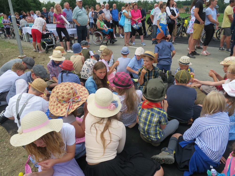 Ve čtvrtek ráno jsme vyhodnotili soutěž ve sběru pomerančové a citronové kůry a ve sběru starého papíru. Žáci pátého ročníku si pak pro své spolužáky připravili na rozloučenou několik soutěží a poté jsme se jako správní „retro“ turisté vydali na slavnostní otevírání lávky přes řeku Bečvu na cyklostezce. Spolu s dětmi z Ústí jsme vystoupili s krátkých programem. Děti z Ústí zpívaly o cykloturistice, my jsme přidali písničku o krásách pěší turistiky. Za horkého poledního sluníčka jsme se vydali zpět do školy. Jak jinak než po nové cyklostezce.