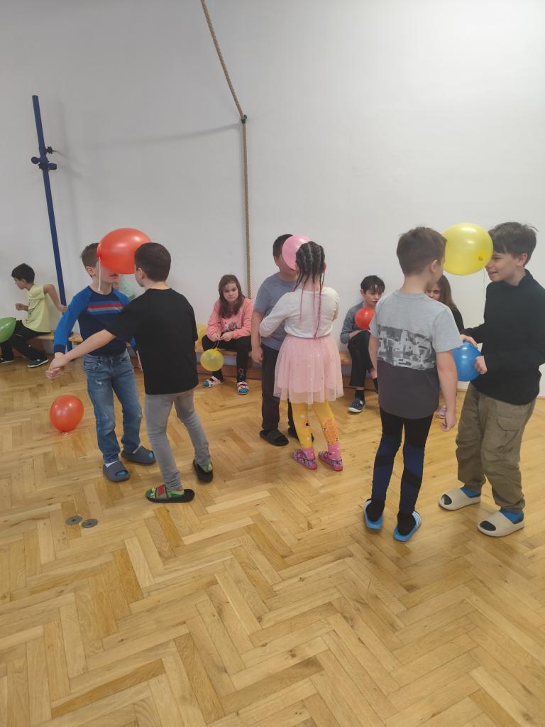 Pak nás čekaly hry a tanec s balónky v tělocvičně. Paní ředitelka pro všechny připravila sladkou odměnu. Hru paní učitelky Janči, na téma zimní sporty, luštila celá škola a doslova po celé škole
