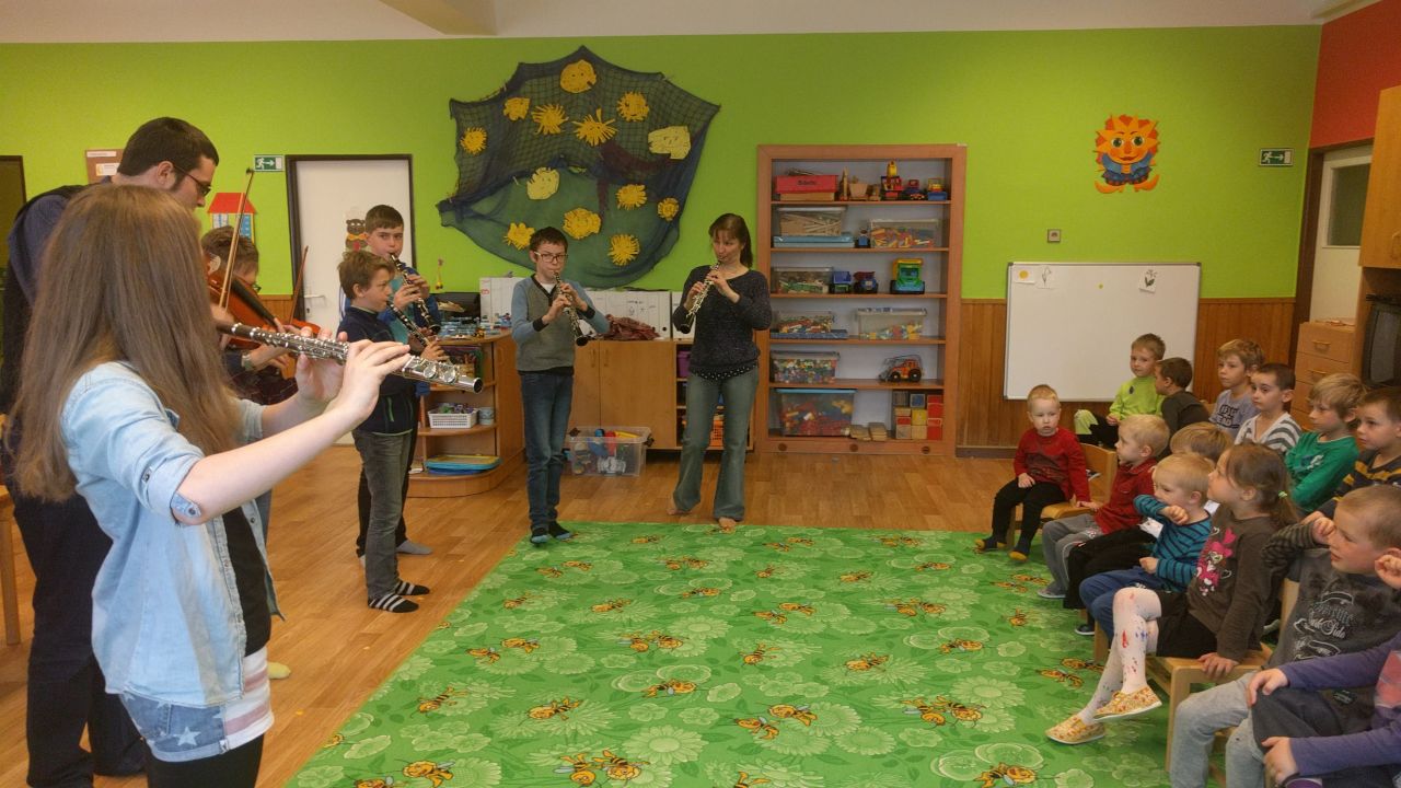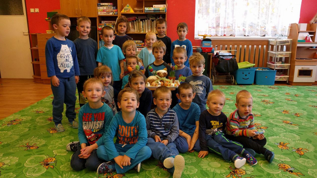 Na Velikonoce si děti nejen vyrobily z hlíny beránka a namalovaly kraslice, ale přípravy vyvrcholily poslední týden, kdy každý den byl v jiné barvě.Zahájili jsme modrým pondělím v modrém oblečení, kdy jsme upekli velikonočního beránka se zajíčkem a zopakovali básničky k Velikonocím. Pokračovali šedým úterým, pečením Jidášků, vyslechli si příběh o zvonu Eliáškovi. Středa byla škaredá, kdy jsme úklidem „vymetli pavouky ze všech koutů.“ Dopoledne přijel na návštěvu p. ředitel, p. učitelka a děti ze ZUŠ z Hranic. Seznámili nás s hudebními nástroji a jejich hra nám vykouzlila na tváři úsměv. Dáša Losová
